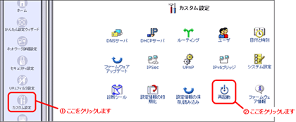 [カスタム設定]画面で、[再起動]ボタンをクリックして、Web Caster 800を再起動します。