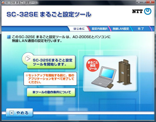 - SC-32SEまるごと設定ツールのタイトル画面が表示されます。「SC-32SEまるごと設定ツールを開始します。」ボタンをクリックし、設定を開始します。詳しくは、SC-32SE取扱説明書(PDFファイル)をダウンロードし、ご参照ください。