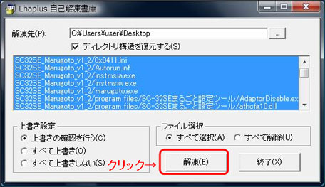 - 指定した場所に保存した「SC32SE_Marugoto_v1_2.exe」をダブルクリックすると、解凍先のフォルダを指定する画面が表示されますので、解凍先を指定して、【解凍】ボタンをクリックします。