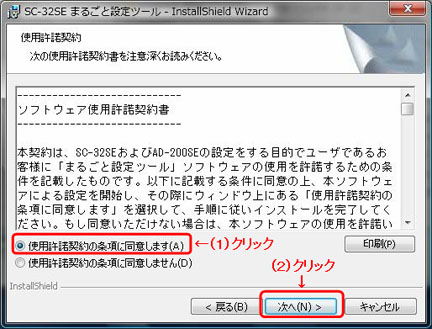 - (1)「使用許諾契約の条項に同意します」をクリックし、(2)「次へ」をクリックします。