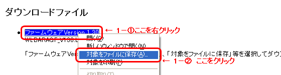 - 本ページの下の方にあるダウンロードファイルの「ファームウェアVersion1.30」の部分を右クリックして、「保存」を選択し、ご利用のパソコンに「ファームウェア」をダウンロードします。