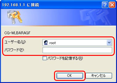 - Webブラウザのアドレス欄に「http://192.168.1.1/」と入力し、キーボードの「Enter」キーを押すと、ユーザー名とパスワードを入力する画面が表示されますので、ユーザー名の欄に「root」、パスワード欄に「お客様が設定したパスワード」を入力し、「OK」ボタンをクリックしてください。