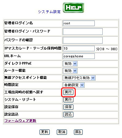 - システム設定画面の「工場出荷時の状態へ戻す」の「実行」ボタンをクリックします。
