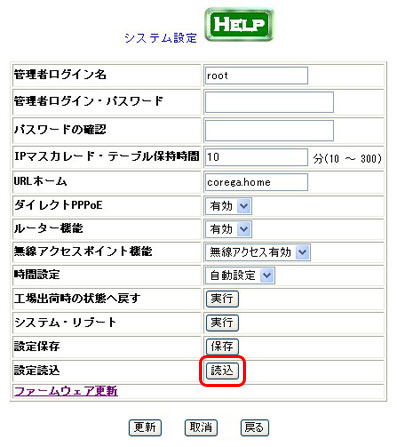 - 手順2〜4を参考にして再度Web Caster WLBARAGFのシステム設定画面を表示し、「設定読込」の「読込」ボタンをクリックします。