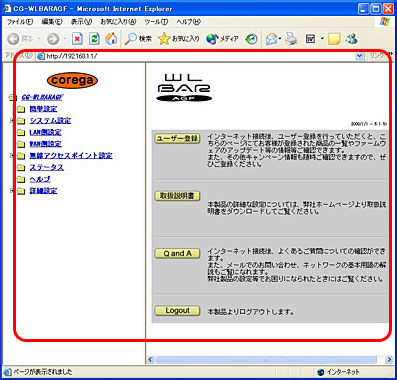 Test LEDが消灯し、Web Caster WLBARAGFの設定画面が表示されます。