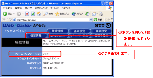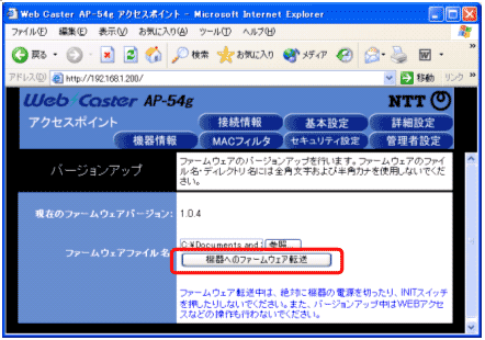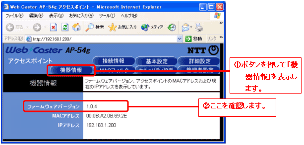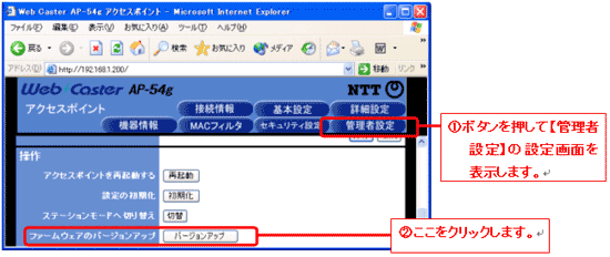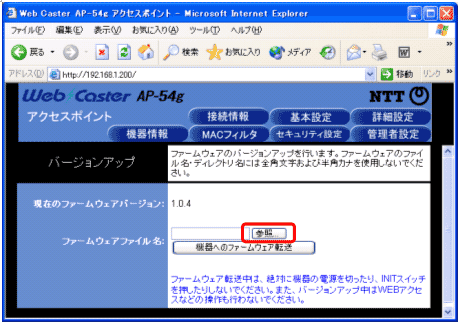 ・ Web Caster AP-54g のファームウェアバージョンが 1.0.4 の場合がバージョンアップ対象です。