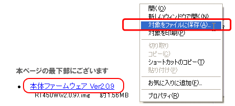 1. 「本体ファームウェア Ver2.0.9」上にマウスカーソルを重ね、右クリックする。
