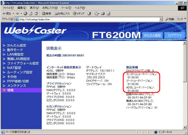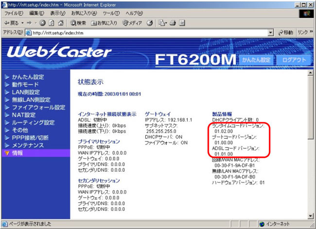 ADSLコードバージョンが 01.00.00 の場合は、バージョンアップを行ってください。