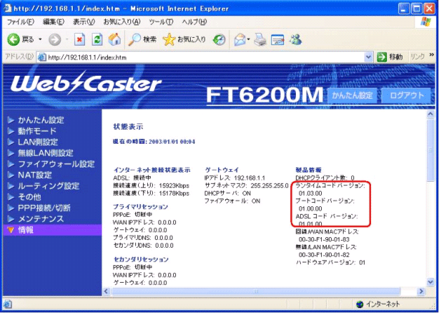 ※ ブートコードバージョン、ADSLコードバージョンはバージョンアップの必要はありません。
