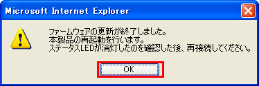 - 本体前面のステータスLEDと電源LEDが交互に点灯し、ファームウェアのバージョンアップが開始されます。バージョンアップが終了すると「ファームウェアの更新が終了しました。」とメッセージが表示されますので、「OK」をクリックします。次に、「このウィンドウを閉じますか?」とメッセージが表示されますので、「はい」をクリックします。