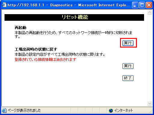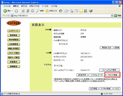 - 手順3〜4を参考にして、設定画面の「状態表示」を表示させ、状態表示画面の「リセット機能」をクリックします。