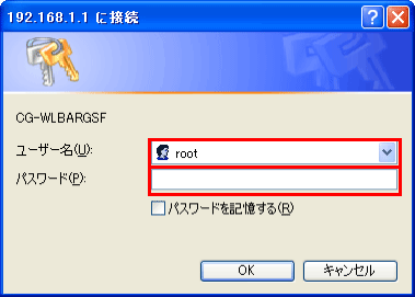 - Webブラウザのアドレス欄に「http://192.168.1.1/」と入力し、キーボードの「Enter」キーを押すと、ユーザー名とパスワードを入力する画面が表示されますので、ユーザー名の欄に「root」、パスワード欄に「お客様が設定したパスワード」を入力し、「OK」ボタンをクリックしてください。