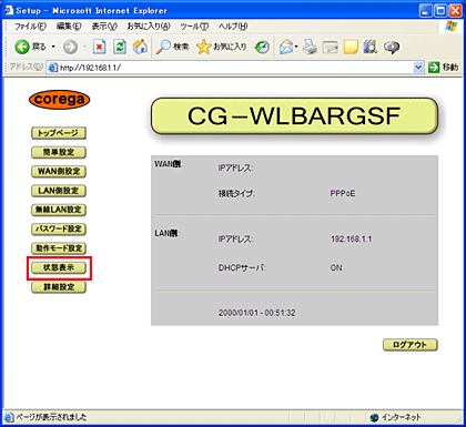 - Web Caster WLBARGSFの設定画面の「状態表示」をクリックしてください。