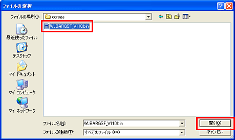 - 「参照」ボタンをクリックしてダウンロードしたファームウェアのファイル(WLBARGSF_V110.bin)を選択し「開く」ボタンをクリックしてください。