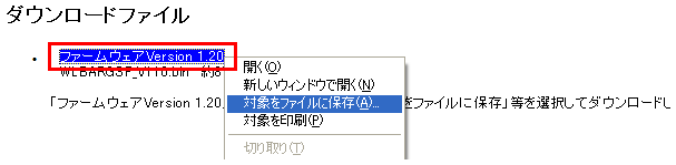 1. 本ページの下の方にあるダウンロードファイルの「ファームウェアVersion1.20」の部分を右クリックして、「保存」を選択し、ご利用のパソコンに「ファームウェア」をダウンロードします。