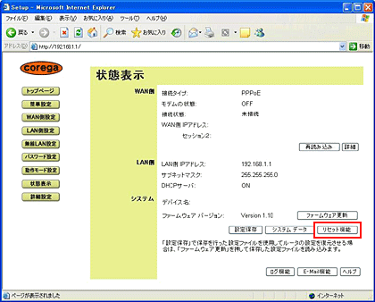 9. 手順2〜3を参考にして、設定画面の「状態表示」を表示させ、状態表示画面の「リセット機能」をクリックします。