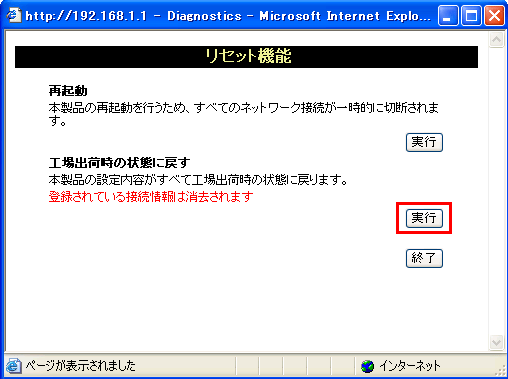 10. 「工場出荷時状態に戻す」の「実行」をクリックします。