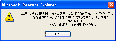 13. 本体前面のステータスLEDと電源LEDが交互に点灯し、設定の更新が開始されます。更新が終了すると「設定内容の更新が成功しました!」とメッセージが表示されますので、「OK」をクリックします。ステースLEDが消灯し、電源LED、接続されているLAN側の100M LEDと通信状態LED、無線LED(有効になっている場合)、WAN LED(接続されている場合)が点灯したら設定の更新が完了します。