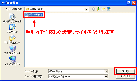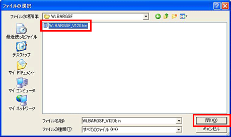 6. 「参照」ボタンをクリックしてダウンロードしたファームウェアのファイル(WLBARGSF_V120.bin)を選択し「開く」ボタンをクリックしてください。