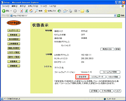 4. 状態表示画面の「設定保存」をクリックしてください。