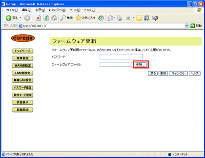 手順2〜3を参考にして、設定画面の「状態表示」を表示させ、状態表示画面の「ファームウェア更新」をクリックします。「参照」ボタンをクリックし、手順4で作成した設定ファイルを選択し、「開く」ボタンをクリックしてください。次に「更新」ボタンをクリックします。