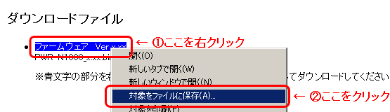 - 以下のファームウェアを右クリックして、「対象をファイルに保存」を選択し、ご利用のPC にダウンロードします。