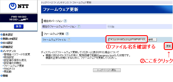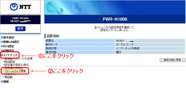 - TOP画面において、「メンテナンス」−「ファームウェア更新」をクリックします。