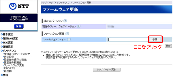 - ファームウェア更新画面において、「参照」ボタンをクリックします。
