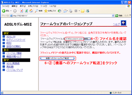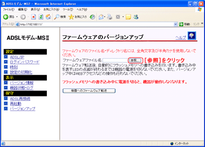 - 画面右側の操作フレームにある【ファームウェアのバージョンアップ】にて[参照]をクリックします。