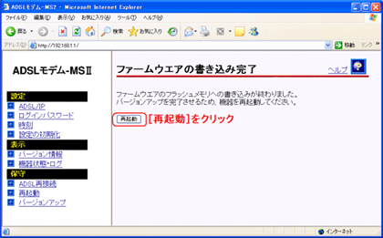 - 「再起動」をクリックします。新しいファームウェアで再起動します。アラームランプの点滅が終了したら、再起動の終了となります。