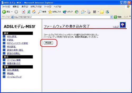 - 「再起動」をクリックします。新しいファームウェアで再起動します。アラームランプの点滅が終了したら、再起動の終了となります。