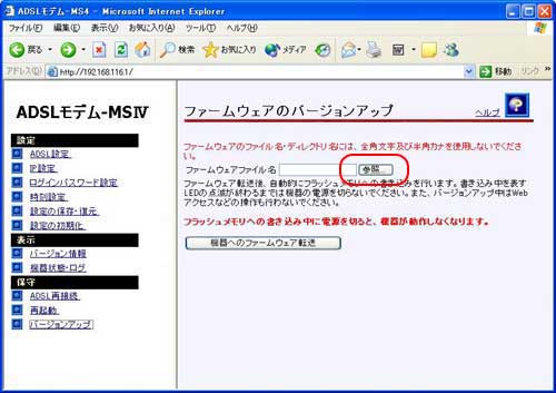 - 【ファームウェアのバージョンアップ】にて「参照」をクリックします。