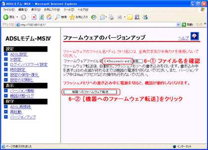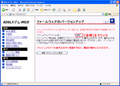 - 画面右側の操作フレームにある【ファームウェアのバージョンアップ】にて「参照」をクリックします。