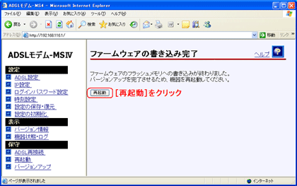 - 「再起動」をクリックします。新しいファームウェアで再起動します。アラームランプの点滅が終了したら、再起動の終了となります。