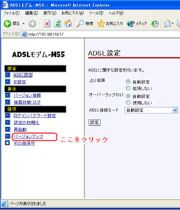 - 設定メニュー画面が表示されましたら、設定画面のメニューフレーム「保守」の「バージョンアップ」をクリックします。