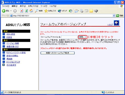 - 画面右側の操作フレームにある【ファームウェアのバージョンアップ】にて「参照」をクリックします。