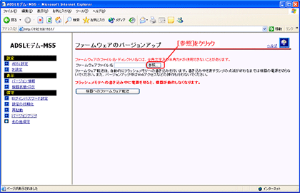 - 画面右側の操作フレームにある【ファームウェアのバージョンアップ】にて「参照」をクリックします。
