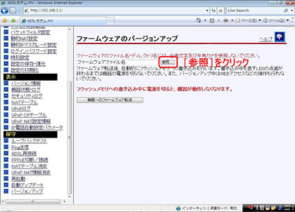 - 画面右側の操作フレームにある【ファームウェアのバージョンアップ】にて「参照」をクリックします。