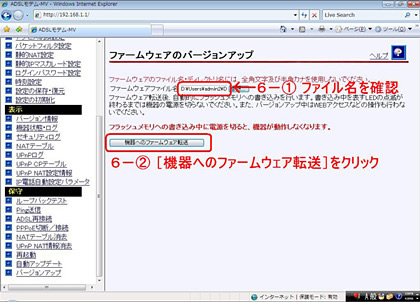 前面のADSL、PPP、LAN及びアラームの各ランプが点滅し機器へのファームウェア転送が行われます。ランプ点滅中は機器の電源を切らないでください。
