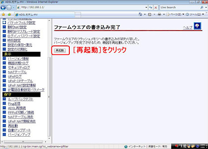 - 再起動が完了したら、設定画面のメニューフレーム「表示」の「バージョン情報」をクリックして、バージョンを確認してください。