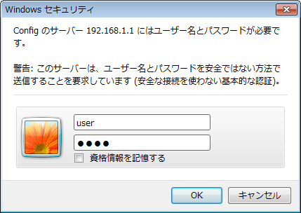 ※ 変更されていない場合は、ユーザ名「user」、パスワード「user」となっています。