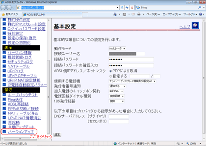 - 設定メニュー画面が表示されましたら、設定画面のメニューフレーム「保守」の「バージョンアップ」をクリックします。
