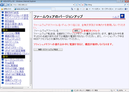 - 画面右側の操作フレームにある【ファームウェアのバージョンアップ】にて「参照」をクリックします。