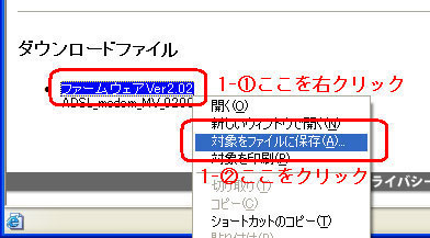 本ページ末尾にあるファームウェアを、ご利用のPCにダウンロードします。 (例)保存方法 ・Windowsの場合、Internet Explorer Ver.6.0 の場合 1. [ファームウェア Ver2.00]上にマウスカーソルを重ね、右クリックする 2. 表示されるポップアップメニューの[対象をファイルに保存]をクリックする ・Macintosh(R) でInternet Explorer Ver.5.1 の場合 1. [ファームウェア Ver2.00]上にマウスカーソルを重ね、Controlキーを押したままクリックする 2. 表示されるコンテクストメニューの「リンクをディスクにダウンロード」をクリックする |