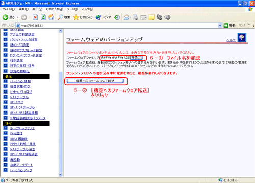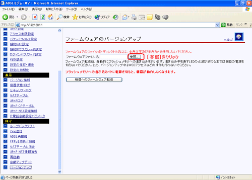 - 画面右側の操作フレームにある【ファームウェアのバージョンアップ】にて「参照」をクリックします。