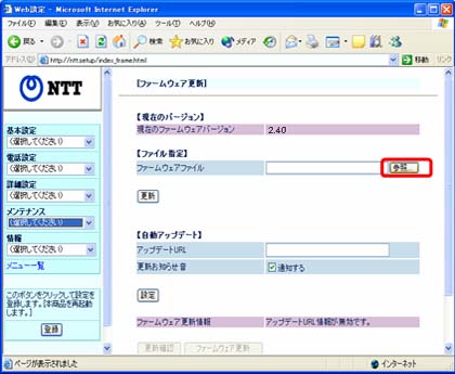 - 【ファイル指定】の「ファームウェアファイル」で[参照]をクリックます。