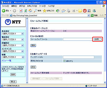 - 【ファイル指定】の「ファームウェアファイル」で[参照]をクリックます。