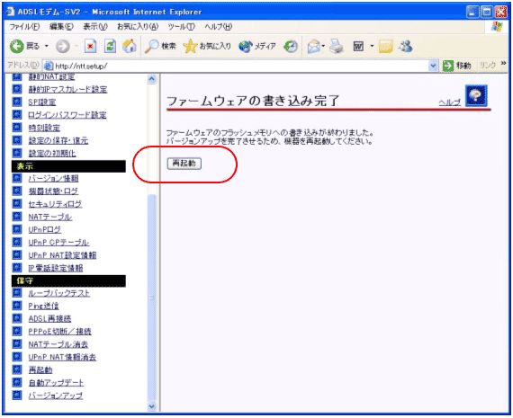 7. 「再起動」をクリックします。新しいファームウェアで再起動します。アラームランプの点滅が終了したら、再起動の終了となります。