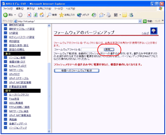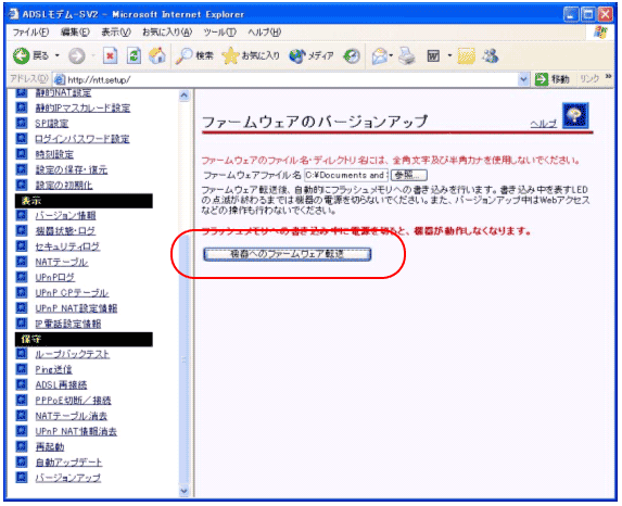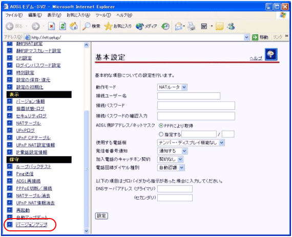 2. PCがADSLモデム-SVIIのLANポートに直接接続されていることを確認し、WebブラウザのURL欄に「http://192.168.116.1/」または、「http://ntt.setup/」を入力します。設定メニュー画面が表示されましたら、設定画面のメニューフレーム「保守」の「バージョンアップ」をクリックします。