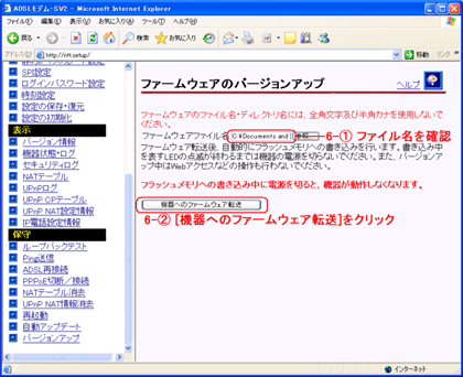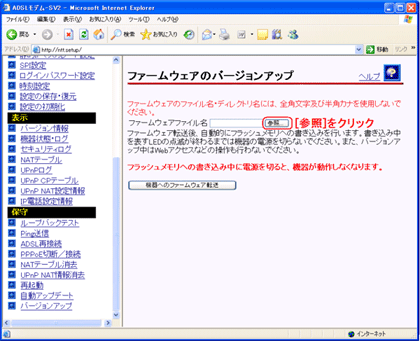 - 画面右側の操作フレームにある【ファームウェアのバージョンアップ】にて「参照」をクリックします。